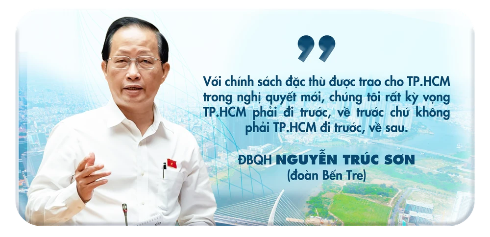 Còn theo ĐB Nguyễn Trúc Sơn (Đoàn Bến Tre), các dự án triển khai tại TP.HCM phần lớn thuộc dạng “đặc biệt”, có ý nghĩa không chỉ đối với TP mà còn cả vùng, cả nước. “Từ rất lâu, TP.HCM vì cả nước, bây giờ cả nước vì TP.HCM. Với chính sách đặc thù này, chúng tôi rất kỳ vọng TP.HCM phải đi trước, về trước chứ không phải TP.HCM đi trước, về sau. Làm sao cho những chính sách chúng ta đưa ra thật sự khả thi trong quá trình thực hiện” - ĐB Sơn nói.