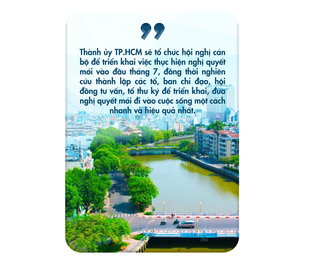 UBND TP.HCM cũng lên kế hoạch trình HĐND TP những nội dung tiếp theo về cơ chế, chính sách theo nghị quyết mới. Mặt khác, Thành ủy TP.HCM sẽ tổ chức hội nghị cán bộ để triển khai việc thực hiện nghị quyết mới vào đầu tháng 7, đồng thời có chỉ thị về việc này và nghiên cứu thành lập các tổ, ban chỉ đạo, hội đồng tư vấn, tổ thư ký để triển khai, đưa nghị quyết mới đi vào cuộc sống một cách nhanh và hiệu quả nhất.