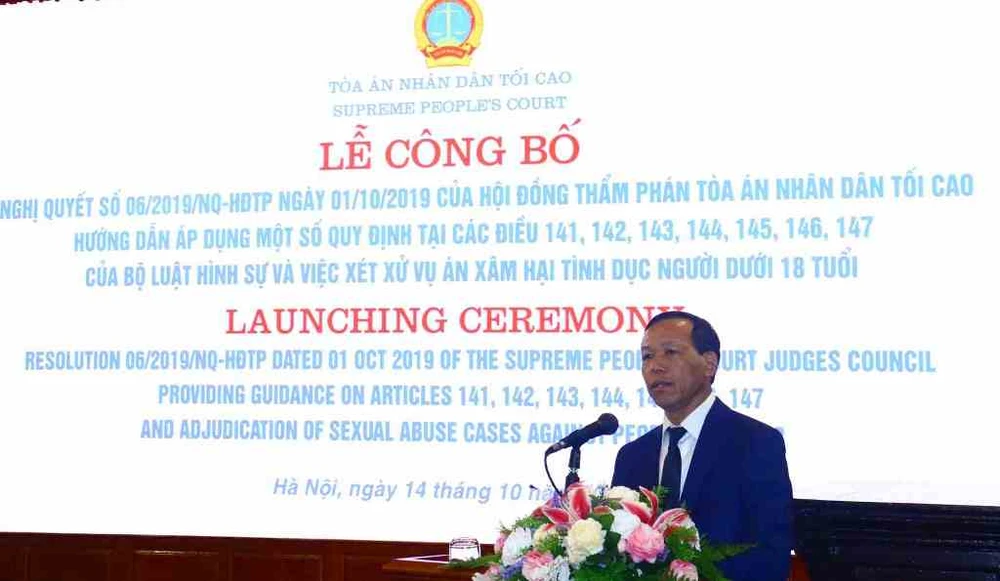 Ngày 14-10, TAND Tối cao đã tổ chức công bố Nghị quyết 06/2019 của Hội đồng Thẩm phán TAND Tối cao. Nghị quyết này nhằm hướng dẫn áp dụng một số quy định tại các điều 141, 142, 143, 144, 145, 146, 147 của BLHS và việc xét xử vụ án xâm hại tình dục người dưới 18 tuổi.