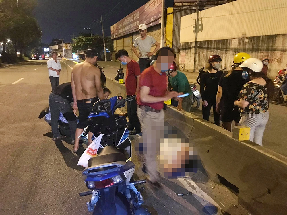 Khi đến khu vực trên thì đâm mạnh vào giải phân cách, ngã ra làn đường ô tô. Cú va chạm khiến anh T. đập vào trụ phản quang bị thương nặng, riêng người đi cùng chỉ bị xây xước.