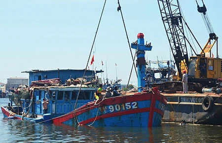 Tàu cá ĐNa 90152 của Việt Nam bị tàu vỏ sắt TQ đâm chìm được trục vớt ở Đà Nẵng ngày 2-6. Ảnh: AFP