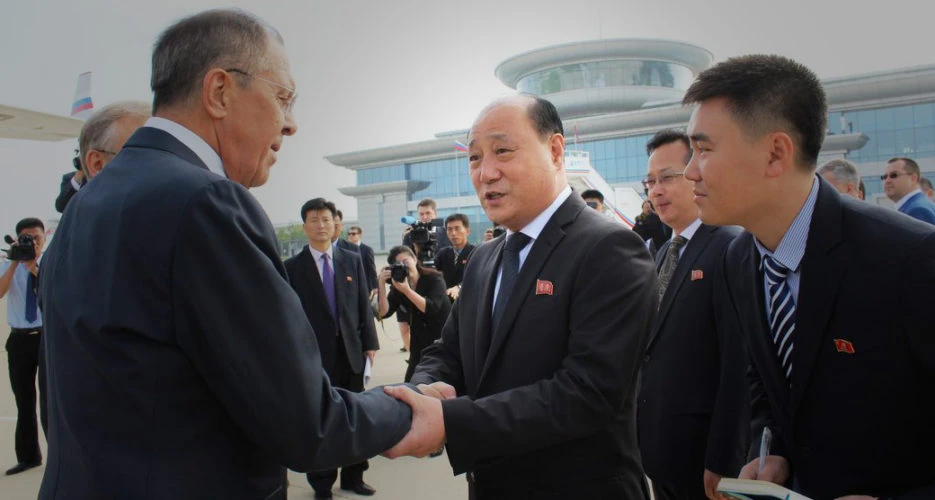 Đại sứ Sin Hong-chol (giữa) khi còn là Thứ trưởng Ngoại giao Triều Tiên bắt tay Ngoại trưởng Nga Sergey Lavrov (trái) trong một lần đón tiếp ông Lavrov tại Bình Nhưỡng. Ảnh: FACEBOOK của Đại sứ quán Nga tại Bình Nhưỡng.