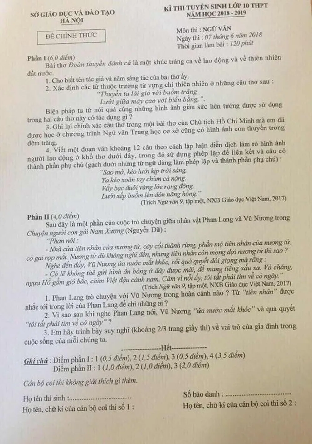 Đề thi tuyển sinh môn văn lớp 10 tại Hà Nội.