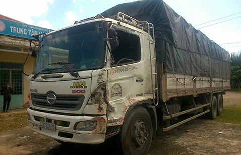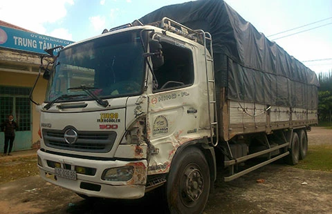 Chiếc xe tải với phần đầu bị móp méo. Ảnh: P.NAM