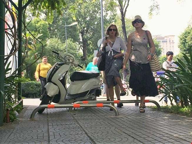 Bà con chỉ trỏ bàn tán, du khách mắt chữ A mồm chứ O vì chưa hiểu dụng ý sâu xa của các bác đô thị. Cho đến khi người ta thấy một cặp đôi quần là áo lượt, nhăm nhăm thẳng hướng vỉa hè, lao ào một phát rồi thắng đánh két trước hàng barie chắn ngang, thấp tè đó nhưng lại vô cùng cứng cáp và kiên quyết.