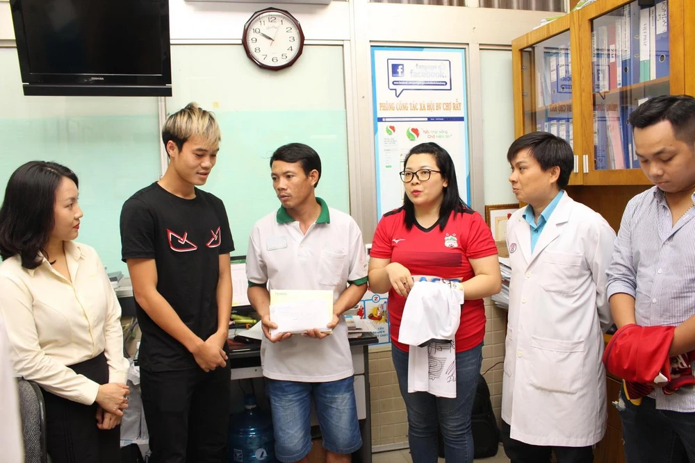 Chị Kiều Oanh (bìa trái) - Đại diện Công ty Ô tô Trường Hải (Thaco) - Nhà tài trợ chính CLB HA Gia Lai gửi tặng cho anh Phát - cha của bé Đạt 50 triệu đồng.