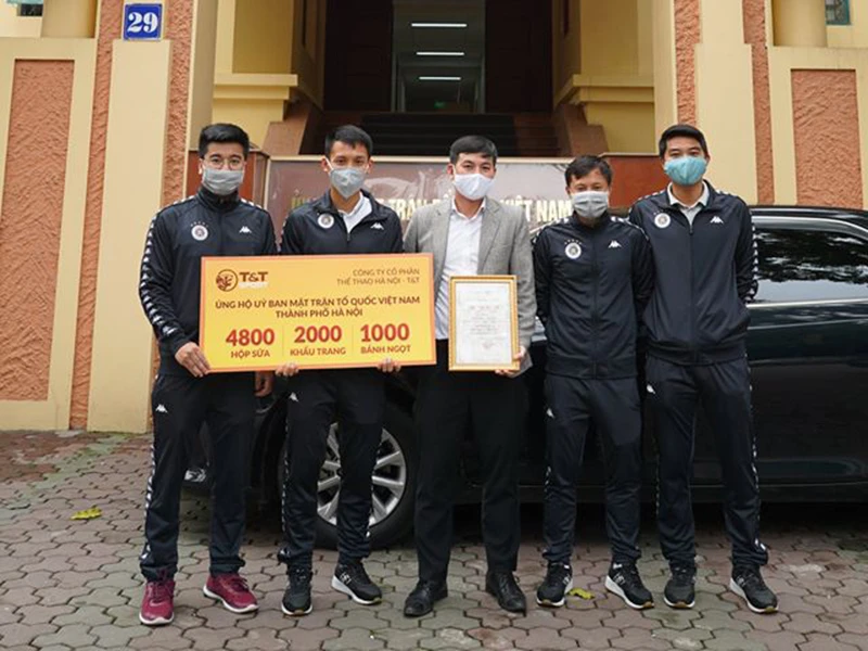 Lãnh đội CLB Hà Nội cùng các trợ lý Nguyễn Tiến Dũng, cầu thủ Phạm Thành Lương và Đỗ Hùng Dũng đã đến trụ sở Ủy ban MTTQ Việt Nam - TP Hà Nội trao tặng 4.800 hộp sữa, 2.000 chiếc khẩu trang vải và 1.000 bánh ngọt. Công ty cổ phần Thể thao Hà Nội - T&T mong muốn những vật phẩm kể trên sẽ được chuyển đến bệnh nhân và cán bộ y tế, dân quân hậu cần đang thực hiện nhiệm vụ trên địa bàn Hà Nội trong thời gian sớm nhất.