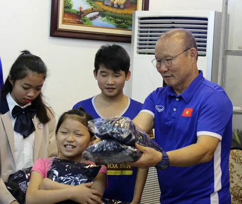 Nhà cầm quân người Hàn Quốc tỏ ra rất vui khi cảm nhận trong ánh mắt, nụ cười của các em một niềm tin mãnh liệt về những điều tốt đẹp của cuộc sống và xúc động khi nghe các em chia sẻ tình yêu của mình dành cho đội tuyển.