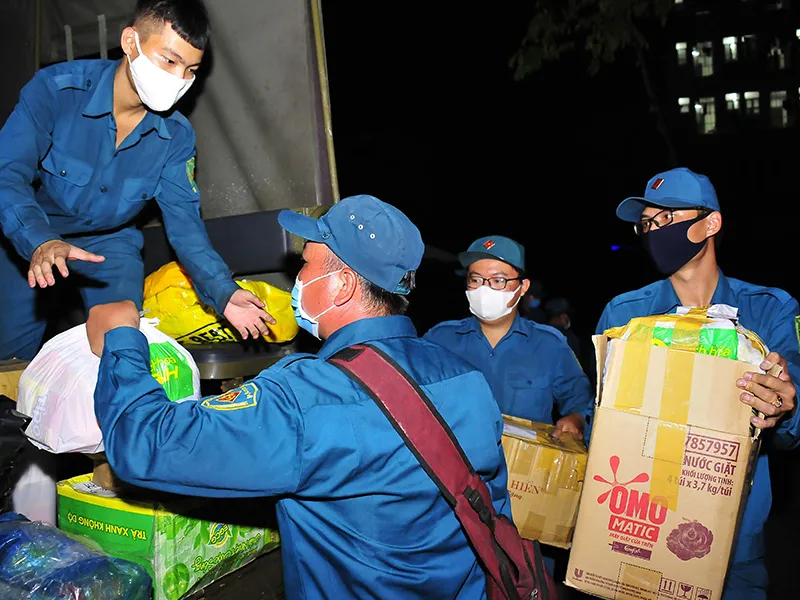 16 giờ chiều một ngày đầu tháng 4, 32 thành viên của Đội dân quân tự vệ quận Tân Phú nhắc nhau mặc đồ bảo hộ, chuẩn bị phát cơm chiều cho người đang cách ly. Không khí trở nên rộn ràng, khẩn trương hơn khi chiếc xe chở thức ăn vừa dừng ngay trước sân. Các thành viên trong đội nhanh chóng chuyển thức ăn vào bên trong; kiểm tra kỹ lưỡng xem mỗi phần đã có đủ canh, muỗng, đũa hay chưa rồi mới bắt đầu đi giao.