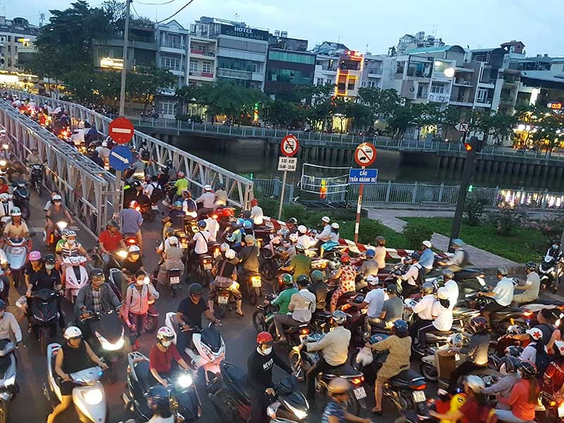 Theo ghi nhận của PV Pháp Luật TP.HCM, vào giờ cao điểm sáng và chiều, tại khu vực hai đầu cầu Trần Khánh Dư luôn xảy ra tình trạng kẹt xe kéo dài hàng giờ. Tại đây, không chỉ hàng trăm phương tiện và người tham gia giao thông “chôn chân” trên cây cầu sắt cũ kỹ mà các tuyến đường dẫn đến cầu cũng bị ùn tắc hàng cây số. Không chỉ vậy, việc lên xuống dốc hai đầu cầu càng thêm khó khăn khi dòng người xe nối đuôi nhau trên đường Hoàng Sa, Trường Sa chiếm hết đường lên xuống cầu.