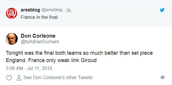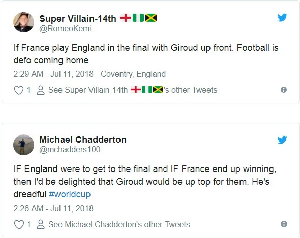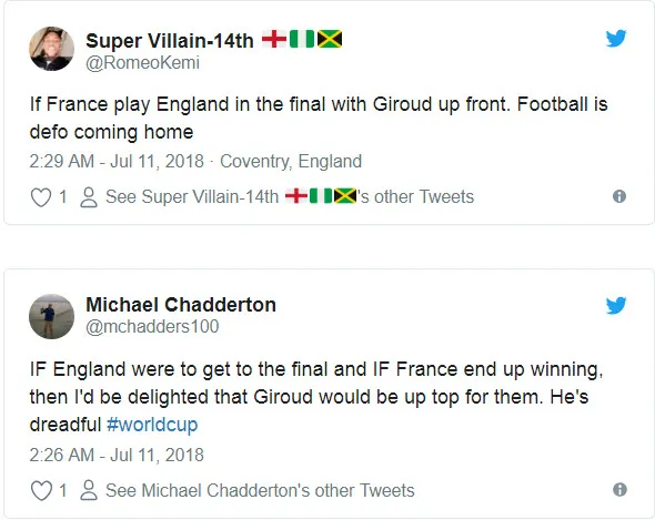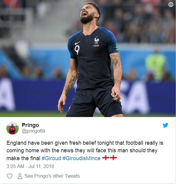 Nhiều người Anh tin rằng có Giroud trên sân, tuyển Pháp sẽ vô hại và bớt mạnh hơn. Việc Giroud không thể thi đấu có khi lại là điều có lợi cho HLV Didier Deschamps và tuyển Pháp. Một khi Giroud không thể thi đấu ở trận chung kết World Cup 2018 ở Moscow thì nhiều khả năng tiền đạo Ousmane Dembele của Barcelona sẽ là lựa chọn thay thế.