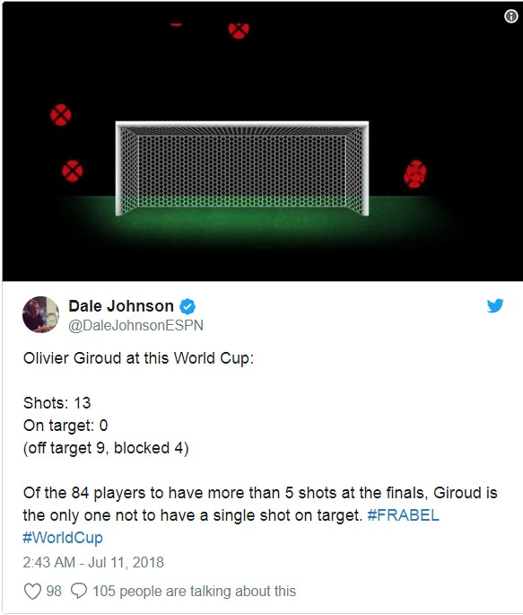 Thống kê của một fan trên Twitter cho thấy Giroud dứt điểm tệ thế nào ở World Cup 2018, 13 cú sút và 0 bàn thắng.