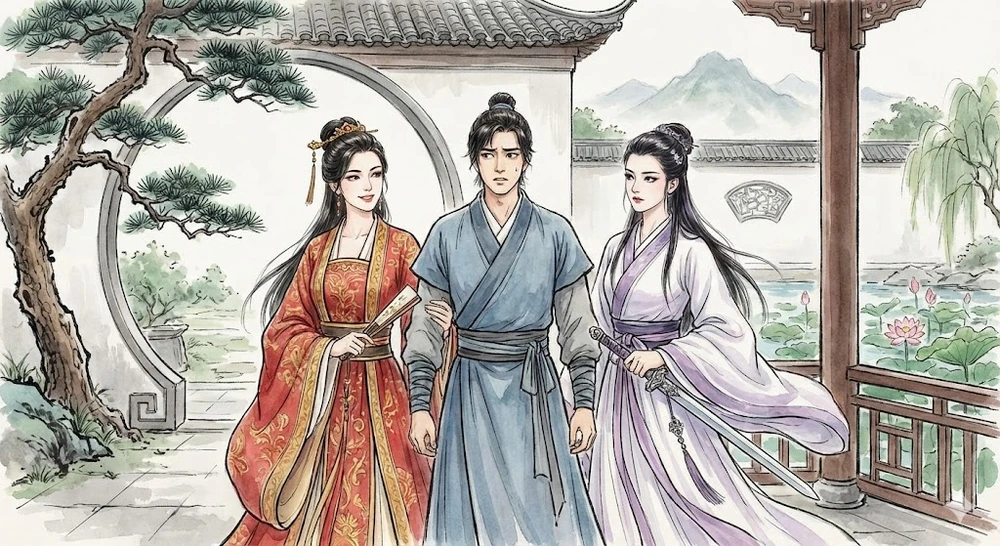 Trương Vô Kỵ tiến thoái lưỡng nan giữa hai người đẹp Triệu Mẫn và Chu Chỉ Nhược. Ảnh minh họa: Gemini
