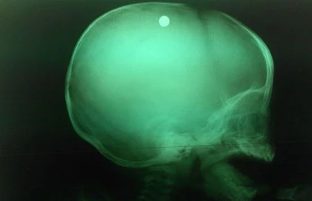 Phim chụp X-quang sọ cho thấy viên đạn vẫn còn nằm trong sọ của bé. Ảnh: WEBSITE BV NHI ĐỒNG 2