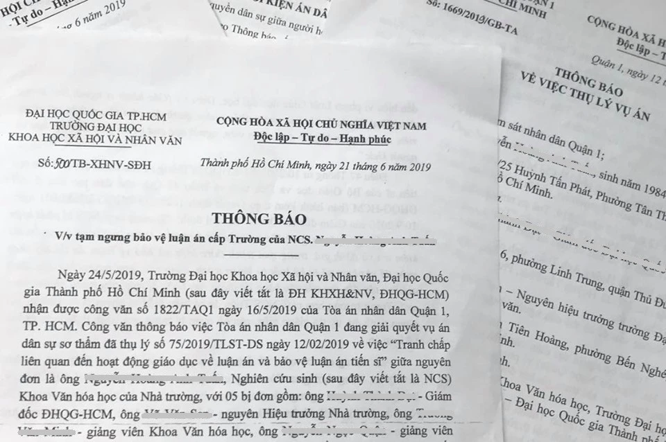 Tiếp đó, ngày 21-6, Trường ĐH KHXH&NV TP.HCM ra thông báo về việc tạm ngưng bảo vệ luận án cấp trường đối với ông T. Trong thông báo này, phía bị đơn chỉ ra nhiều vi phạm của ông T. như liên tục có những hành vi xúc phạm danh dự, uy tín, thậm chí vu khống một số giảng viên, cán bộ quản lý nhà trường, có dấu hiệu vi phạm Luật giáo dục đại học. Do đó, nhà trường đã ra quyết định tạm ngưng việc bảo vệ luận án.