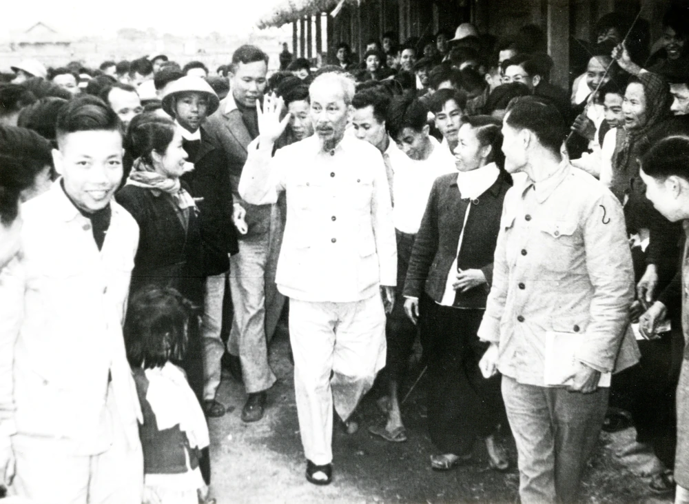 Bác sĩ Trần Hữu Nghiệp - Hiệu trưởng Trường Cán bộ Y tế (đi sau Chủ tịch Hồ Chí Minh) tại buổi lễ đón Chủ tịch Hồ Chí Minh đến dự Hội nghị Tổng kết công tác Y tế tổ chức tại Trường năm 1956. Ảnh chụp lại trong sách.