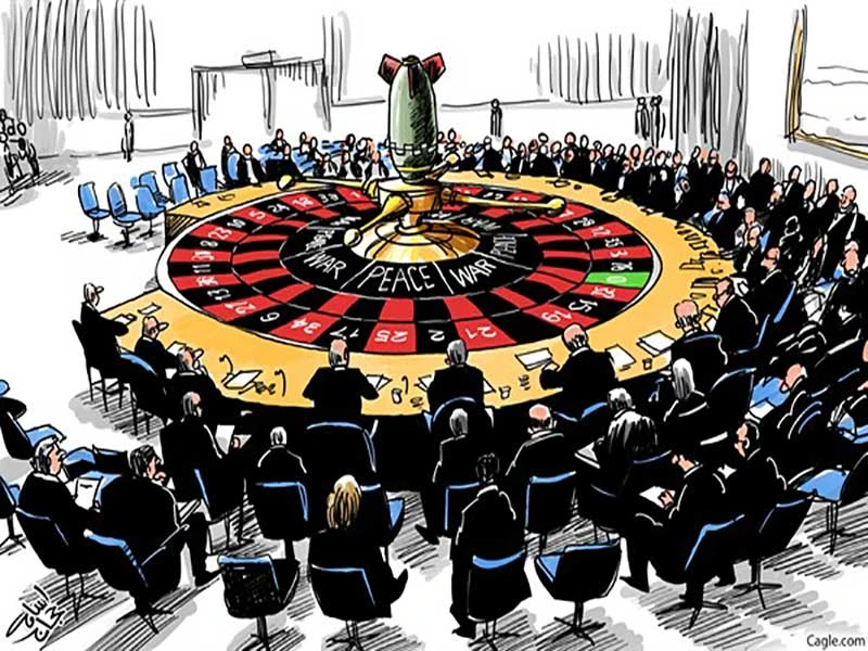 Hội đồng Bảo an LHQ đứng trước bài toán chiến tranh và hòa bình ở Syria. Biếm họa của OSAMA HAJJAJ (Jordan)