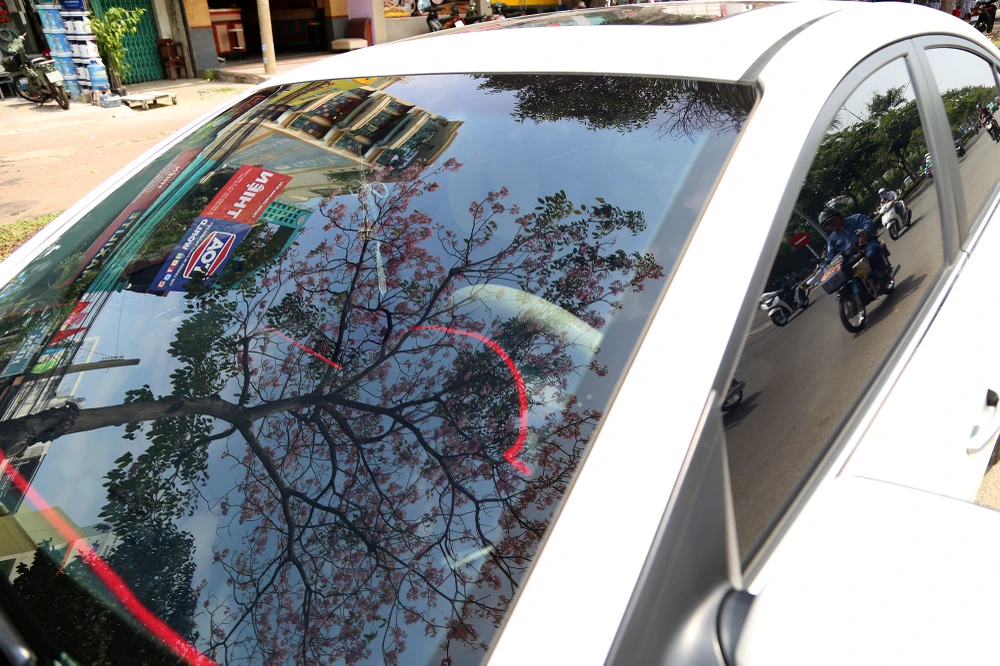 Một cây kèn hồng rực rỡ in bóng trên kính xe ô tô bên đường.