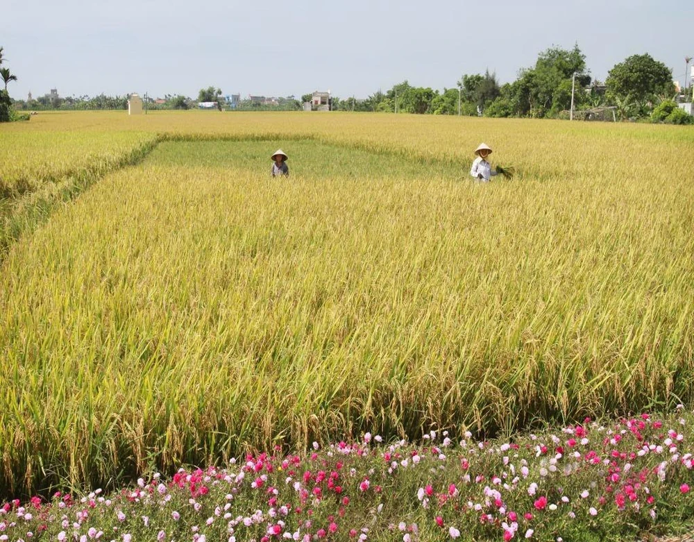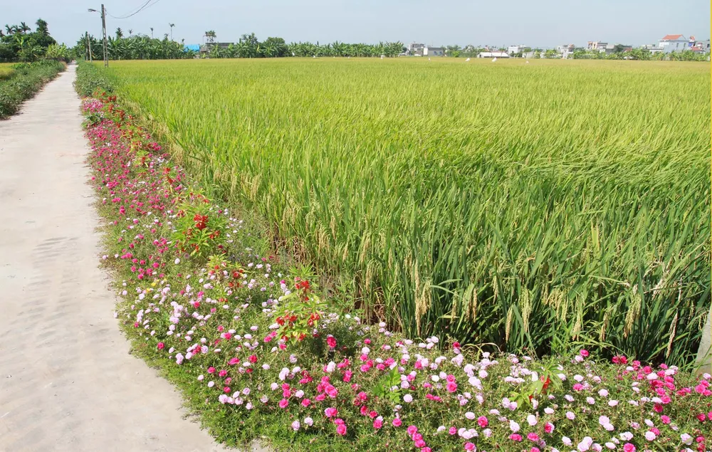 Đường hoa ôm lấy ruộng lúa trĩu hạt.
