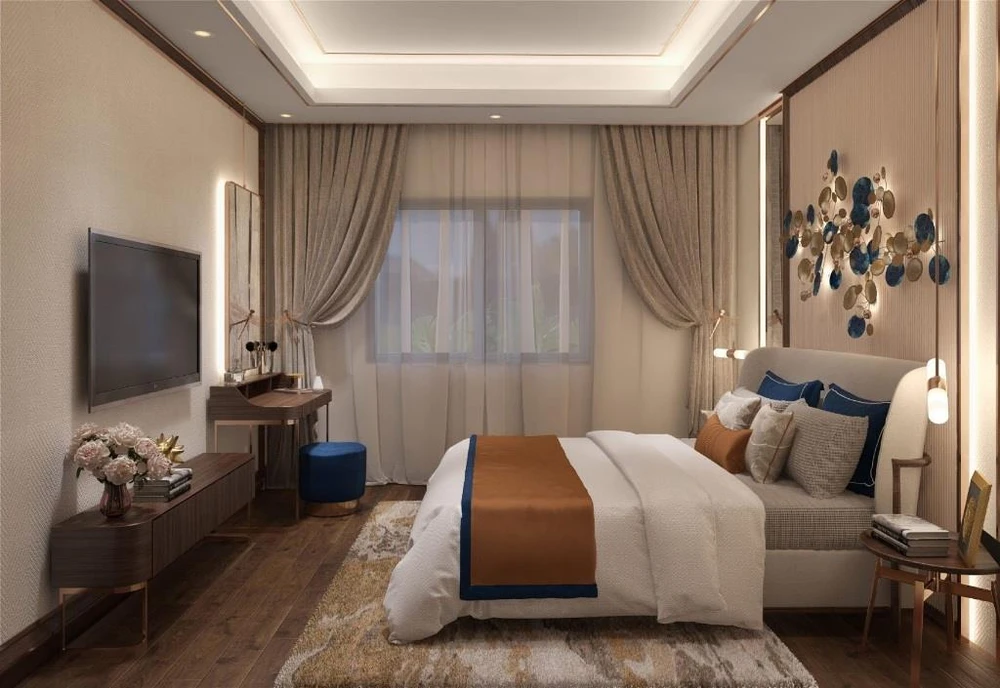 Thiết kế phòng khách sử dụng tông màu vàng hồng, cam đất và xanh đậm ấm áp và sang trọng.
