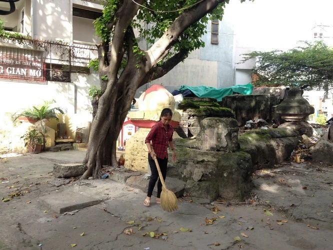 Người dân tự quét dọn phần vỉa hè trước mộ. Bên cạnh mộ cổ này là Tổ bảo vệ dân phố khu phố 7. Ông Nguyễn Văn Lợi, tổ viên, cho biết tổ phải thường xuyên ra trông chừng, nhắc nhở, không thì có nhiều người vô ý thức đến phóng uế, vứt rác.