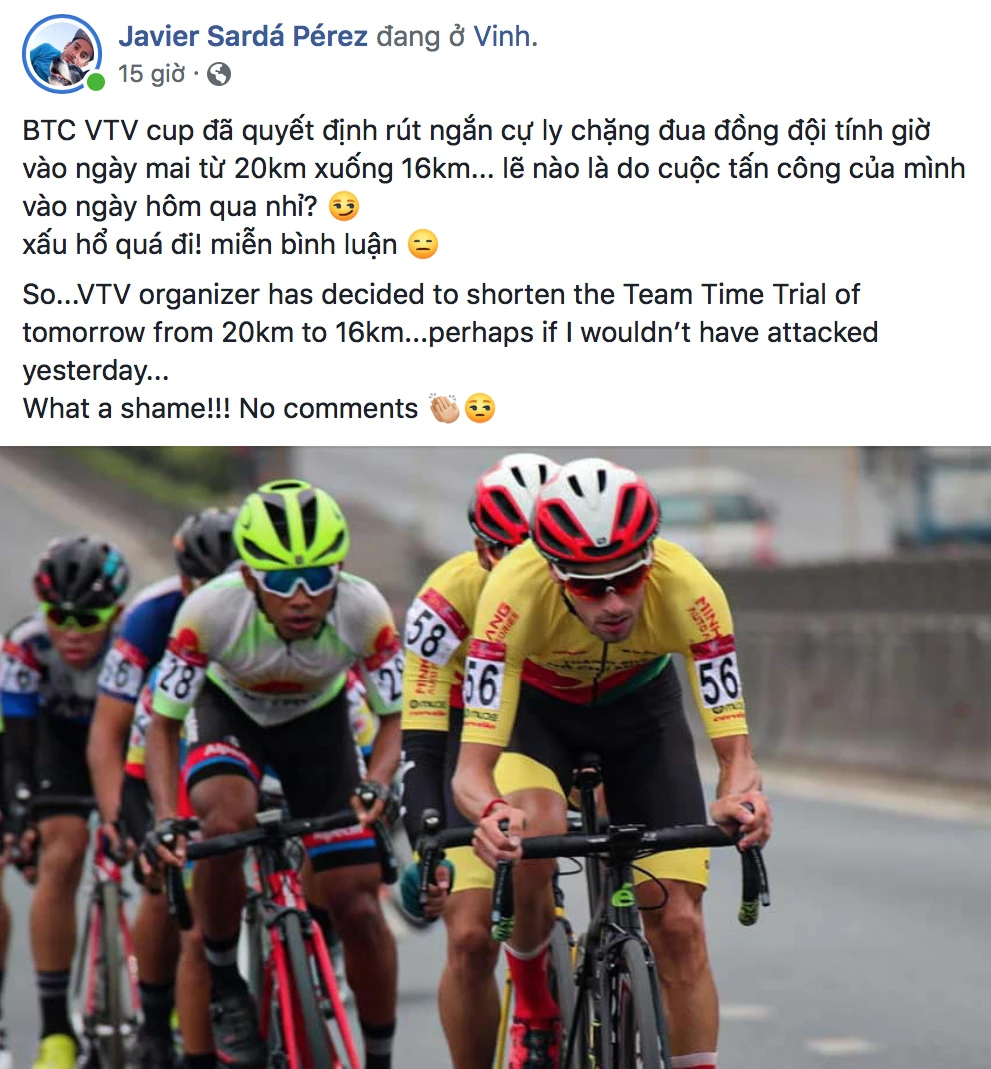 Trên trang cá nhân, tay đua người Tây Ban Nha Javier đặt dấu hỏi: “BTC VTV Cup quyết định cự ly chặng đua đồng đội tính giờ vào ngày mai từ 20 km xuống 16 km…lẽ nào là do cuộc tấn công của mình vào ngày hôm qua nhỉ? Xấu hổ quá!!! Miễn bình luận”.