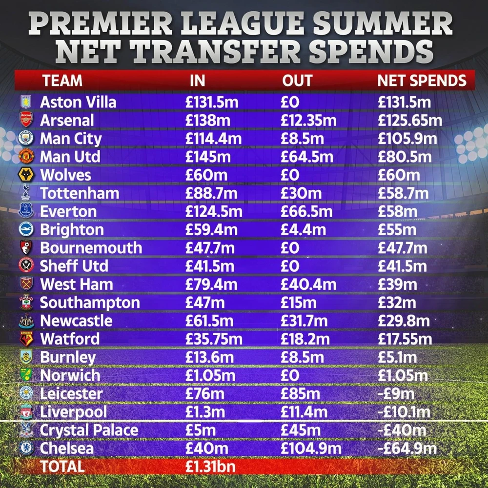 Tuy nhiên dẫn đầu thị trường chuyển nhượng Anh là đội bóng mới lên hạng Aston Villa khi mua sắm hết 131,5 triệu bảng nhưng không thu lại đồng nào từ việc bán cầu thủ.