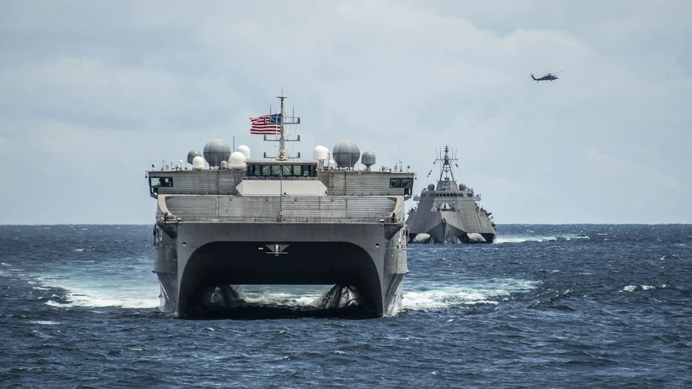 Tàu chiến và máy bay trực thăng của Hải quân Mỹ tham gia cuộc tập trận ở Biển Đông vào tháng 10-2019. Ảnh: U.S. NAVY