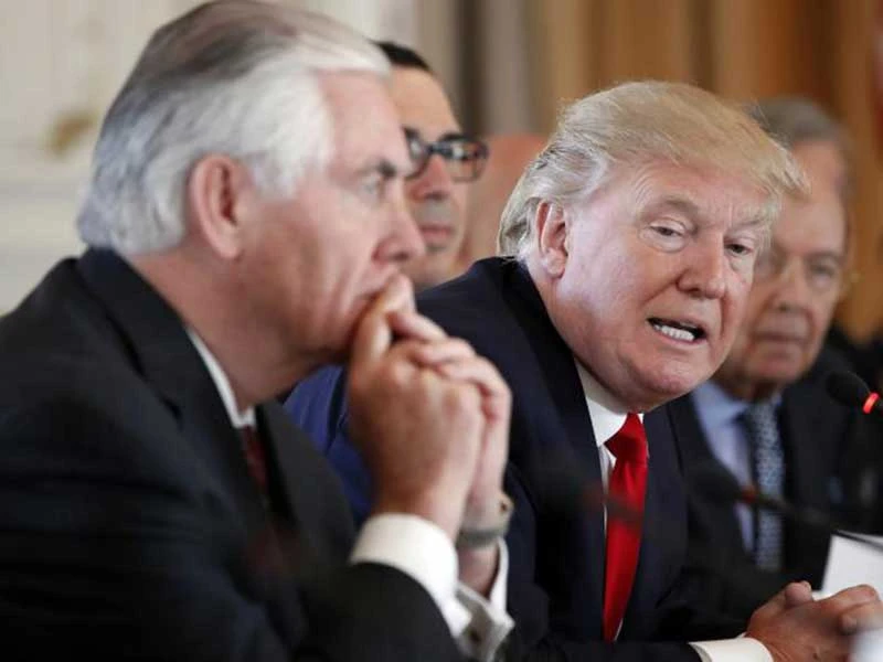 Tổng thống Mỹ Donald Trump (phải) và Ngoại trưởng Mỹ Rex Tillerson trong cuộc gặp song phương với Chủ tịch Trung Quốc Tập Cận Bình vừa qua. Ảnh: AP
