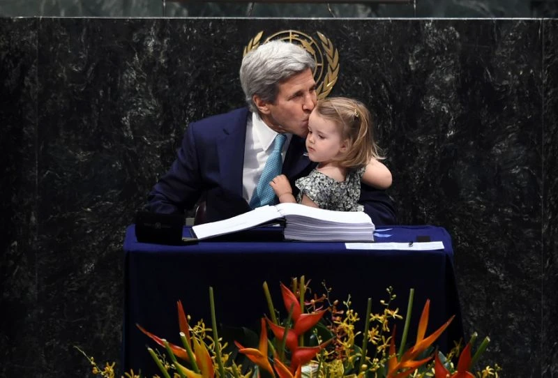 AFP đưa tin Ngoại trưởng Mỹ John Kerry đã đưa cháu gái tới trụ sở của Liên Hiệp Quốc ở New York, Mỹ ngày hôm 22-4 để ký Hiệp định về chống biến đổi khí hậu ở Paris cùng đại diện của 175 quốc gia khác.