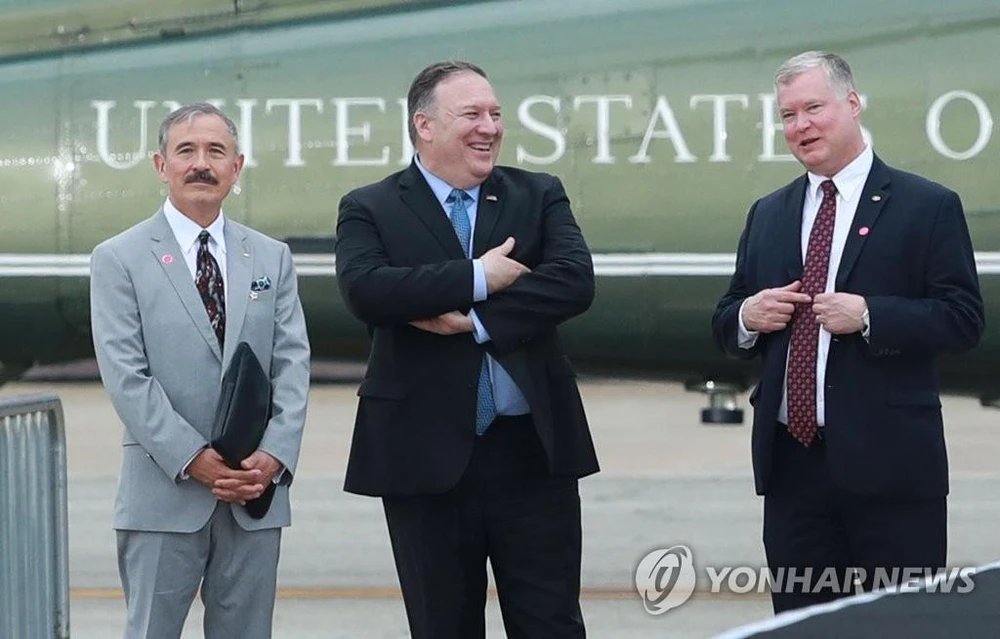 Từ trái sang phải: Đại sứ Mỹ tại Hàn Quốc Harry Harris, Ngoại trưởng Mỹ Mike Pompeo và Đại diện đặc biệt của Mỹ tại Triều Tiên Stephen Biegun tại căn cứ không quân Osan ở Pyeongtaek, phía nam Seoul, vào ngày 30-6-2019. Ảnh: Yonhap.