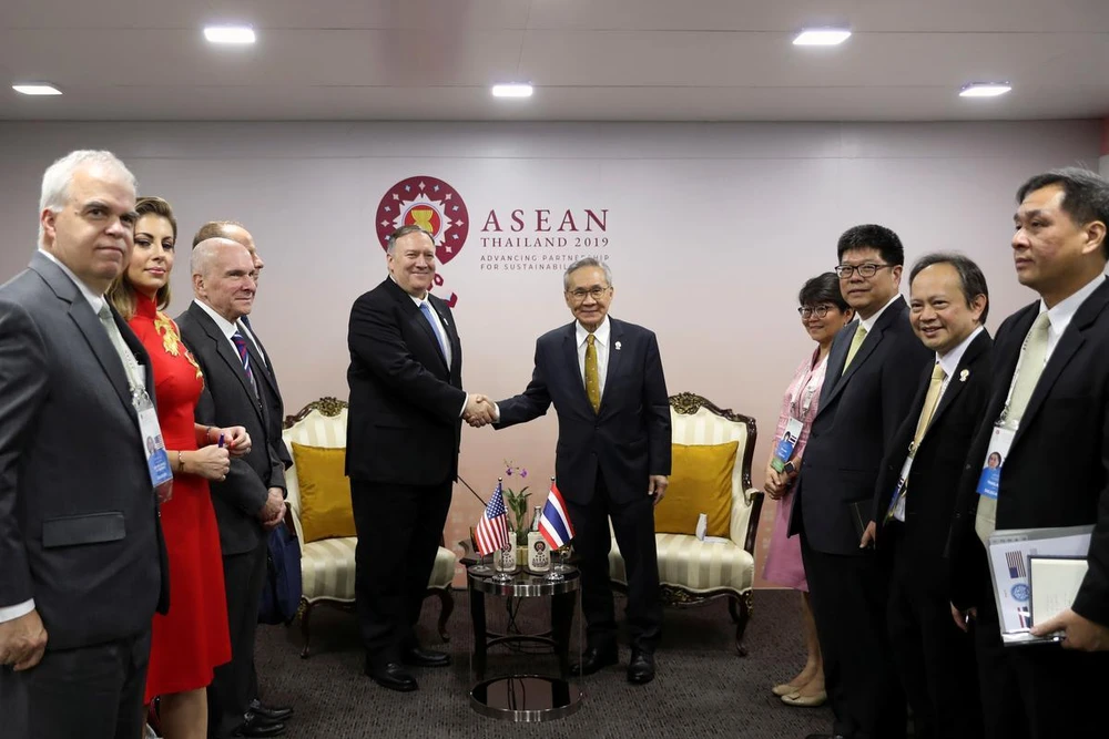 Ngoại trưởng Mike Pompeo bắt tay người đồng cấp Thái Lan Don Pramudwinai trong cuộc họp với các Ngoại trưởng ASEAN hôm 1-8. Ảnh: REUTERS