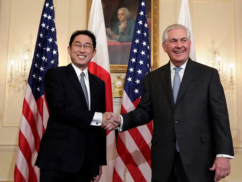 Ngoại trưởng Nhật Bản Fumio Kishida và ông Rex Tillerson trong cuộc họp tại Bộ Ngoại giao Mỹ ở Washington hồi tháng 2. Ảnh: REUTERS