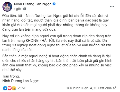 “Đầu tiên, tôi – Ninh Dương Lan Ngọc gửi lời xin lỗi đến các đơn vị nhãn hàng, đối tác, người thân, gia đình, bạn bè và đặc biệt là quý khán giả vì khiến mọi người phải đọc những thông tin không hay đang tràn lan trên mạng vừa qua.