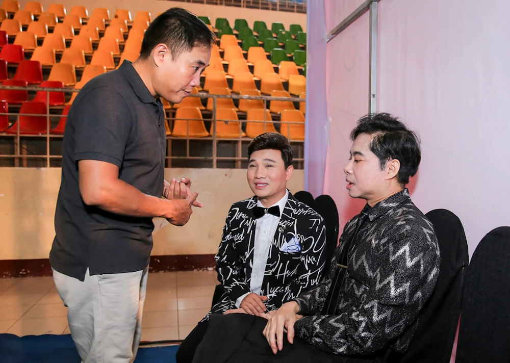 Nhạc sĩ Minh Vy (đứng) trao đổi cùng hai cố vấn âm nhạc: Ngọc Sơn và Quang Linh của chương trình Cặp đôi hoàn hảo - Trữ tình và bolero