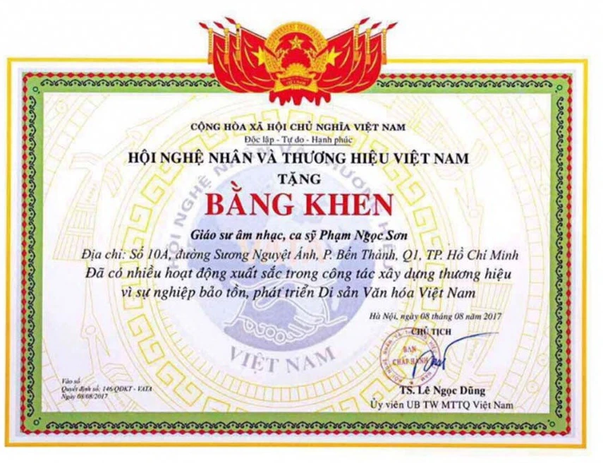 Trong thông tin gửi báo chí, đại diện ca sĩ Ngọc Sơn cho biết: “Nam ca sĩ vui mừng khi được Hội Nghệ nhân và Thương hiệu VN tặng bằng khen vì có những hoạt động xuất sắc trong sự nghiệp bảo tồn, phát triển di sản văn hóa VN. Bằng khen này phong tặng cho anh danh hiệu “GS âm nhạc”. Ngọc Sơn đã không giấu được niềm vui khi được nhà nước ghi nhận với danh hiệu này. Có thể xem Ngọc Sơn là nam ca sĩ Việt duy nhất hiện nay được ghi nhận danh hiệu GS. Với anh, danh hiệu này không chỉ là nguồn động viên mà còn là động lực để anh tiếp tục phấn đấu, cống hiến cho âm nhạc và tiếp tục chia sẻ, dìu dắt các thế hệ ca sĩ đàn em tiếp tục cố gắng theo đuổi hết mình với nghề nghiệp...”.