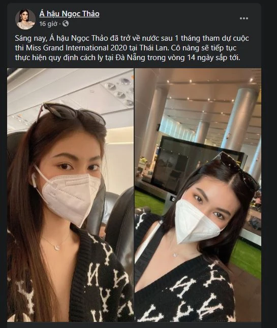 Sau 10 ngày kết thúc đêm chung kết Miss Grand International 2020 và đạt thành tích tốp 20, á hậu Ngọc Thảo đã đáp chuyến bay về Việt Nam.