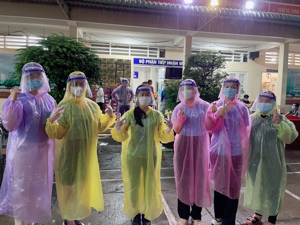 Tuân thủ quy định mùa dịch, mỗi người đều trang bị khẩu trang, kính chắn giọt bắn, bao tay và áo mưa để lên đường. Mặc cho trời mưa tầm tã nhưng dàn người đẹp vẫn bất chấp khó khăn, đội mưa đi đến tận vùng cách ly y tế.