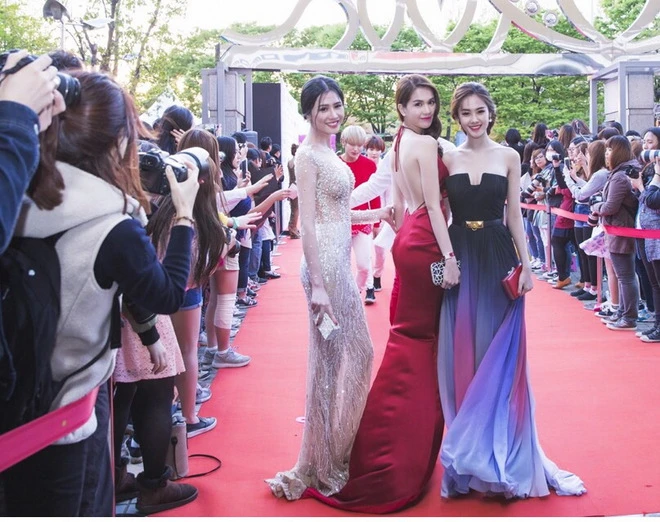 Người mẫu Tường Vy, Ngọc Trinh, Linh Chi (từ trái qua) xuất hiện trên thảm đỏ sân vận động Olympic, Seoul, Hàn Quốc - nơi diễn ra Festival Model Awards 2015. Sự kiện thu hút đông đảo sự quan tâm của khán giả và giới truyền thông Hàn.