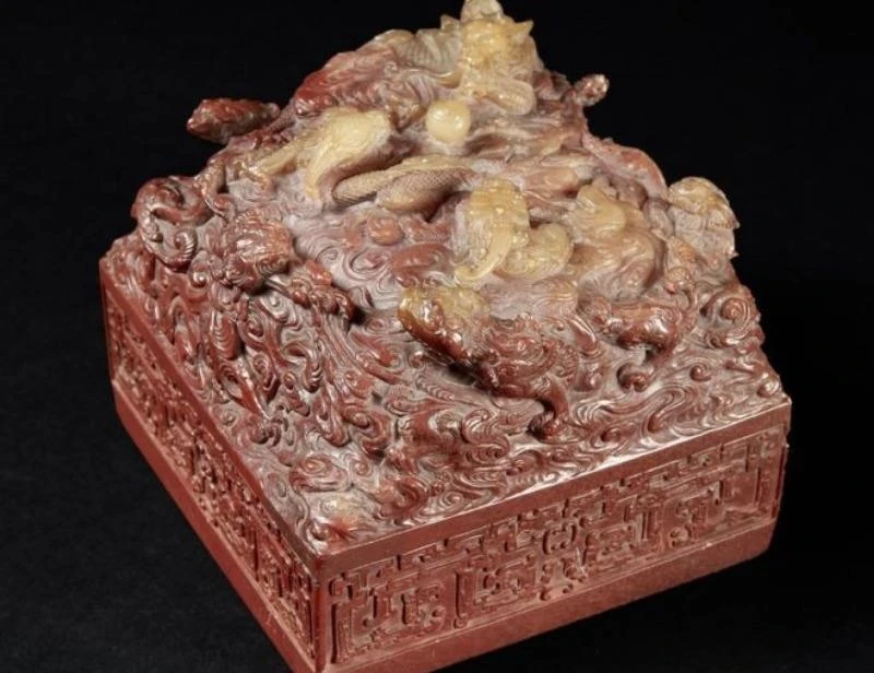 Ngọc tỷ có kích cỡ vừa bằng bàn tay, làm từ đá phiến màu đỏ pha trắng, chạm khắc chín con rồng.