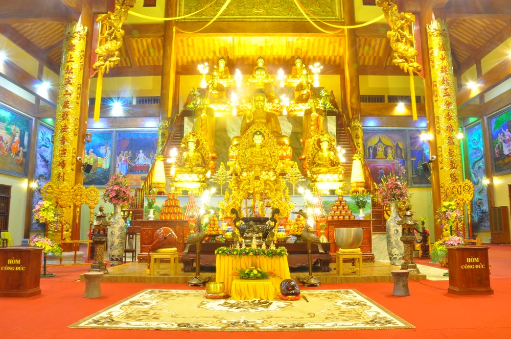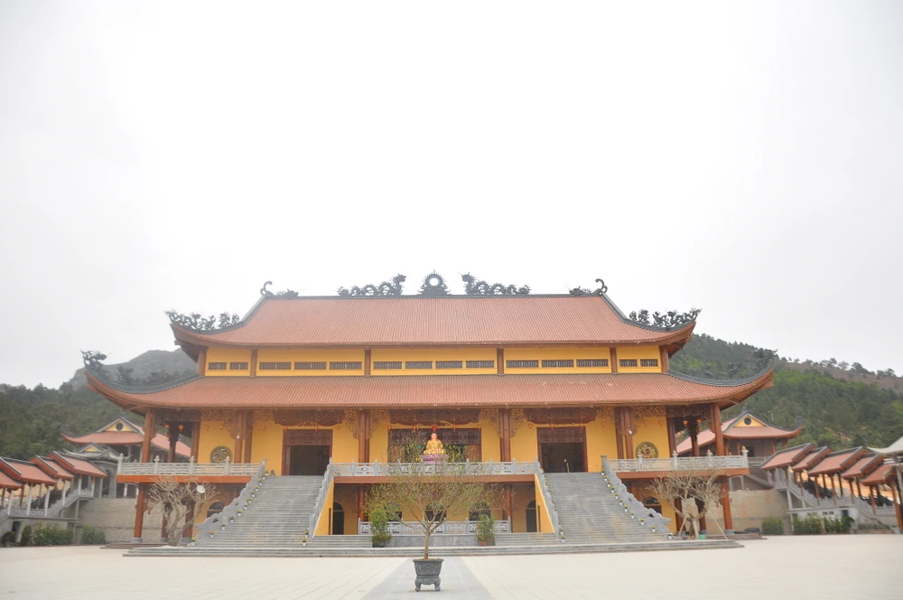 Chính điện (Đại Hùng Bảo Điện) như một cái ngai khổng lồ, lưng ngai tọa hướng Bắc, dựa vào ngọn núi cao nhất, lớn nhất, vững chãi nhất. Hai bên trái, phải là hai ngọn núi thấp dần tượng trưng cho hai tay ngai: tay trái là hướng Đông – Thanh Long, tay phải là hướng Tây – Bạch Hổ. Ngôi Đại Hùng Bảo Điện, nơi trung tâm hài hòa, điểm hội tụ tâm linh, một điểm sáng của trí tuệ không ngừng phát triển.