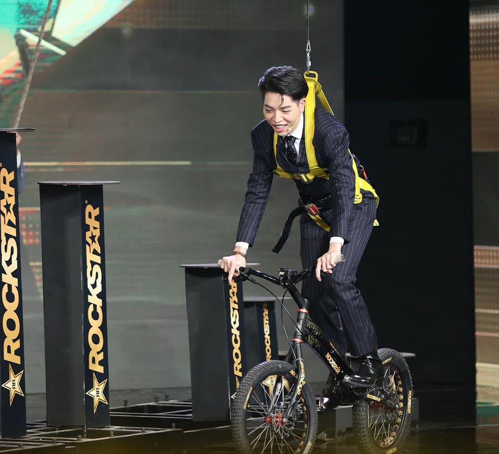 Cảm thấy hứng thú với chiếc xe đạp không yên, Đức Phúc đã thử điều khiển trial bike để đạp vài vòng trên sân khấu.