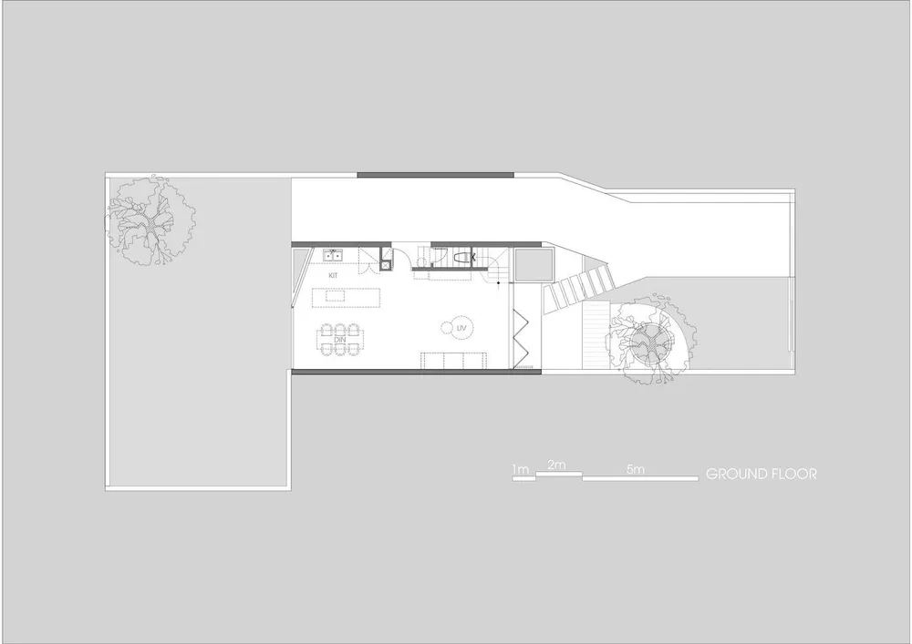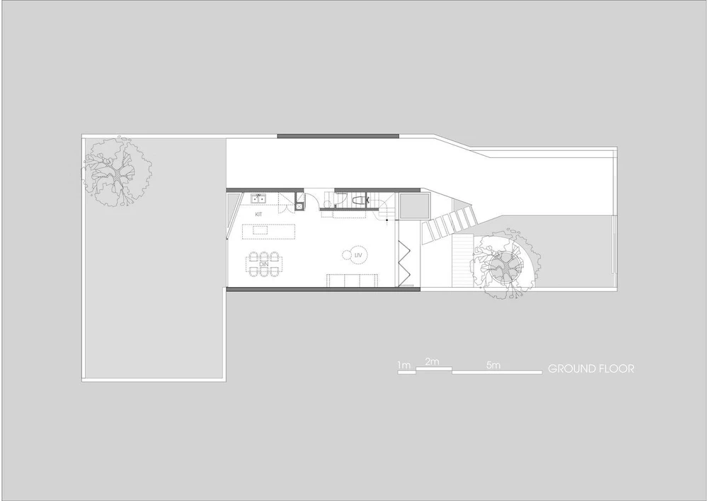 Phòng khách, bếp và bàn ăn đều hướng ra ngoài thiên nhiên của khoảng sân trước và sau. |