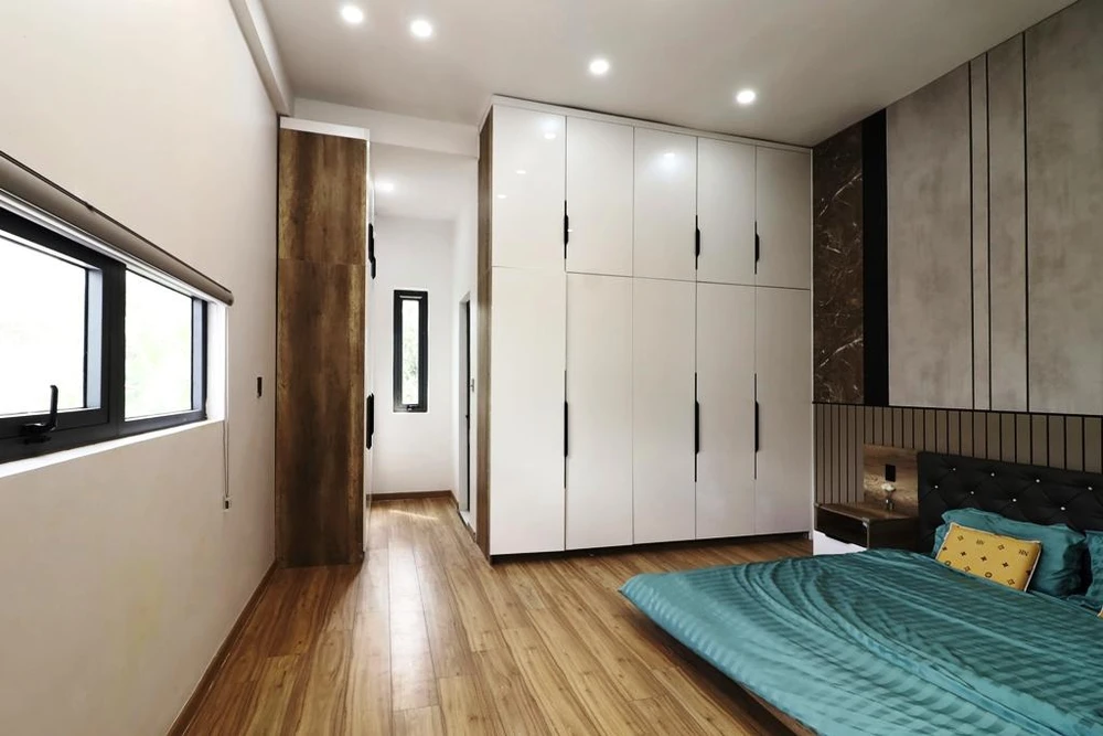 Phòng ngủ được lát sàn gỗ, hệ tủ áp tường đơn giản. |