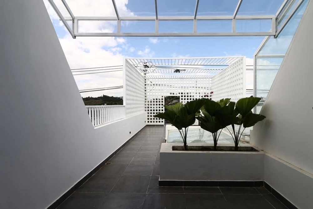 Màu trắng của những ô gạch làm nổi bật cả không gian tầng thượng. |
