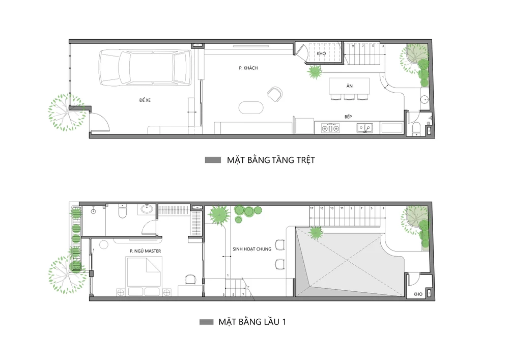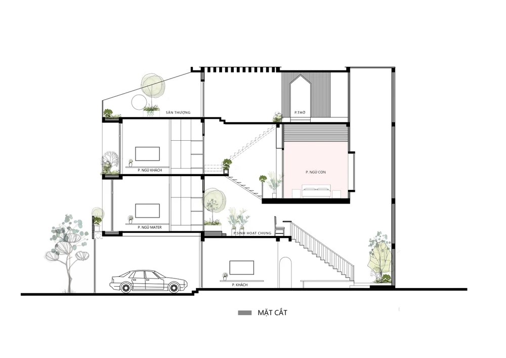 Để ngôi nhà vừa thông thoáng vừa kết nối nhưng lại có sự riêng tư, kiến trúc sư đề xuất giải pháp kỹ thuật với ba thủ thuật xử lý kết hợp là thông tầng lệch, lệch tầng, lệch thang.
