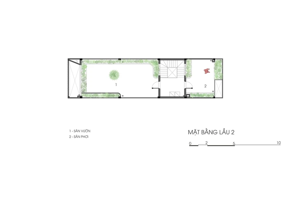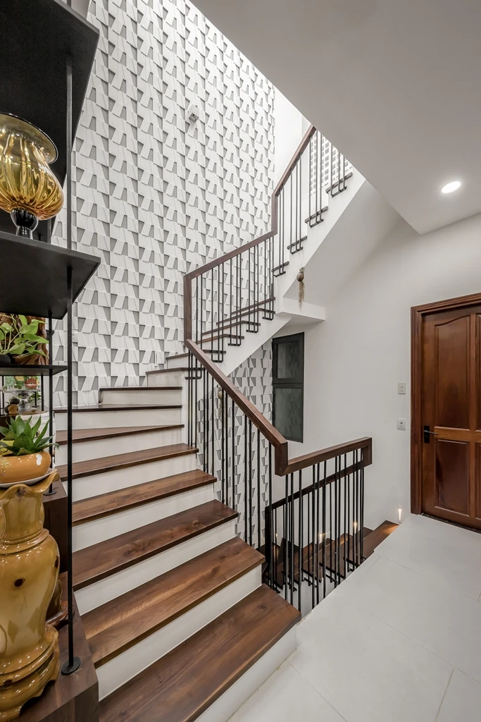 Khu vực giếng trời cũng được trang trí tạo điểm nhấn bằng bức tường gạch 3D ghép có tác dụng tiêu âm giảm tiếng ồn (tiếng nói, tiếng mưa rơi…) theo phương đứng.