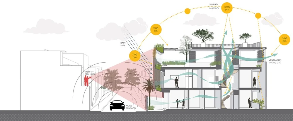 Thứ nhất, thiết kế nên phân chia không gian động tĩnh theo phương đứng vì khu vực kinh doanh có thể gây ồn ào do đó cần bố trí tách biệt ở tầng trệt. Theo đó, khu vực sống và sinh hoạt sẽ thường ở trên các tầng cao vì cần có sự an toàn, riêng tư và yên tĩnh.