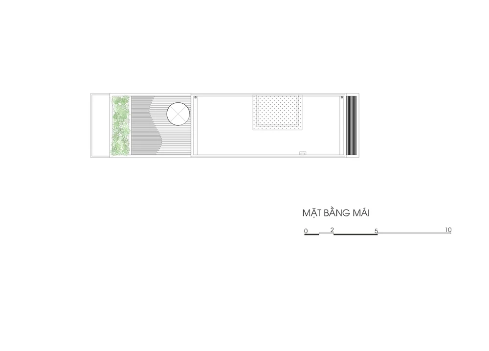 Khu vực sân vườn trên sân thượng dùng để trồng rau sạch với dàn lam gỗ và cây xanh tán lớn che nắng tạo bóng mát để, đồng thời hấp thụ nhiệt không làm nóng cho phòng ngủ ở tầng dưới.