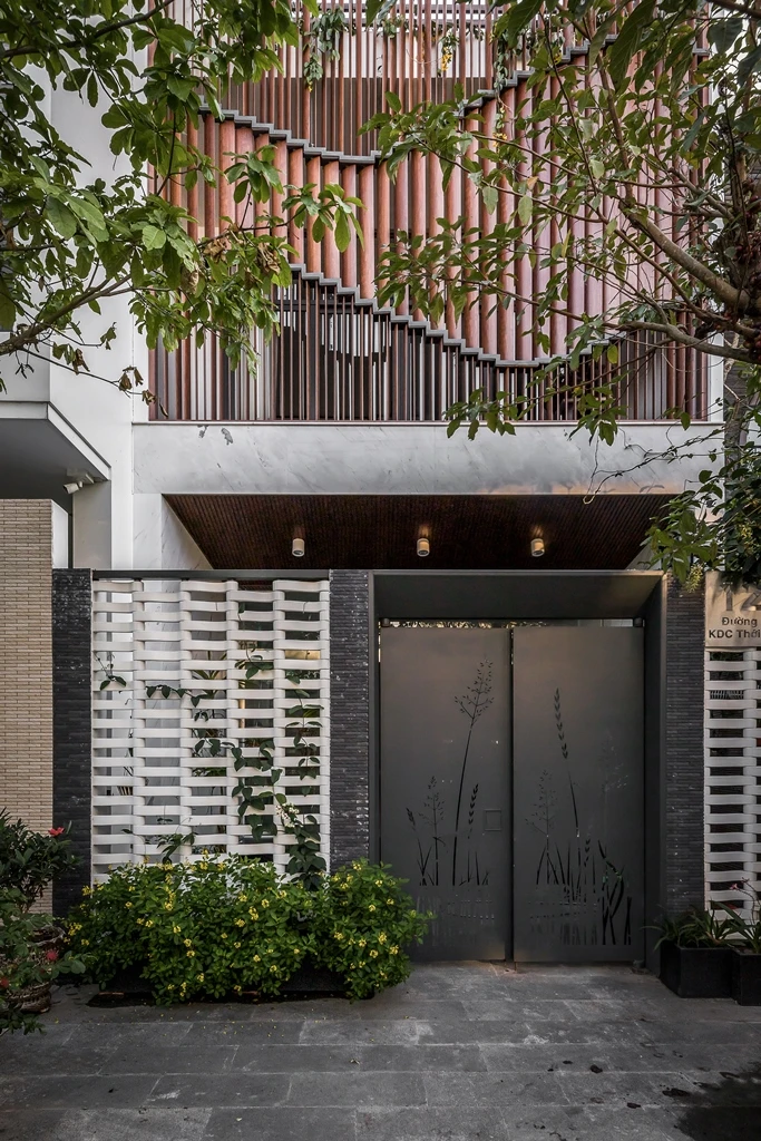 Flexible Façade House xây dựng trên khu đất 105 m2 tại TP Cần Thơ. Công trình đặc biệt bởi kiến trúc sư Trần Công Danh (SPACE+ Architecture) thiết kế thêm một lớp vỏ thứ hai phía mặt tiền, đó là một hệ lam nhôm vân gỗ lõi thép.